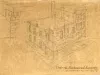 Architectural drawing in pencil on thin paper. Title at bottom right reads "1st Home Parke Davis..16th Scale Model." Text below reads "Dim. to be Reduced in Scale to 3/4" to 1'-0" / For instance - 23'-6" bldg. height x 3/4" = 17 5/8"." Stamped on bottom right "Microfilmed Dec 10 1968." The drawing is a detailed drawing of the original Parke-Davis building, showing measurements of the building and surrounding boardwalk. Possibly done as research for a model of the building.