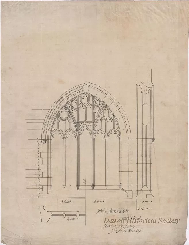 One drawing entitled "Detail of Chancel Window, Church of the Epiphany [Trinity Episcopal Church] for Jas. E. Scripps, Esqr." The drawing consists of black ink on linen and shows a plan view of one of the windows in the English Gothic style church. The details, shown at a scale of 3/4 inch = 1 foot, were part of a group of thirteen sheets that were prepared by Mason & Rice, Architects, of Detroit. The church is located at the corner of Trumbull Avenue and Myrtle Street.