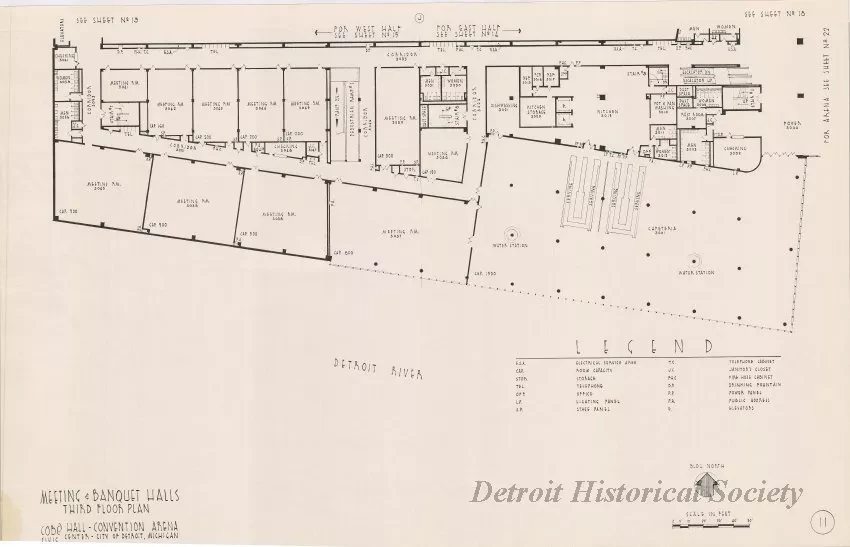 One architectural plan sheet (number 11 of 24) entitled "Meeting & Banquet Halls, Third Floor Plan, Cobo Hall - Convention Arena, Civic Center - City of Detroit, Michigan." The blackline print is a copy of the original drawing and shows the interior layout of the Meeting & Banquet Halls area in the proposed Cobo Hall and Convention Arena development. The drawing is shown at a scale of 1/16 inch = 1 foot. The architect for the project was Louis Rossetti, however, no individual or architectural firm names are shown on the plan sheet.
