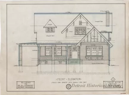 One architectural drawing entitled "Residence for Mr. B. C. Ladendorf, Detroit, Michigan - Front Elevation." The drawing (Job 267) consists of black ink on linen and shows a view of the front of a proposed 2-story house. Some light blue and green pencil shading has been added on the verso to highlight the architectural features. The drawing was was part of a set of nine sheets that were prepared by "J. Lawson Miller, Architect," at a scale of 1/4 inch = 1 foot.