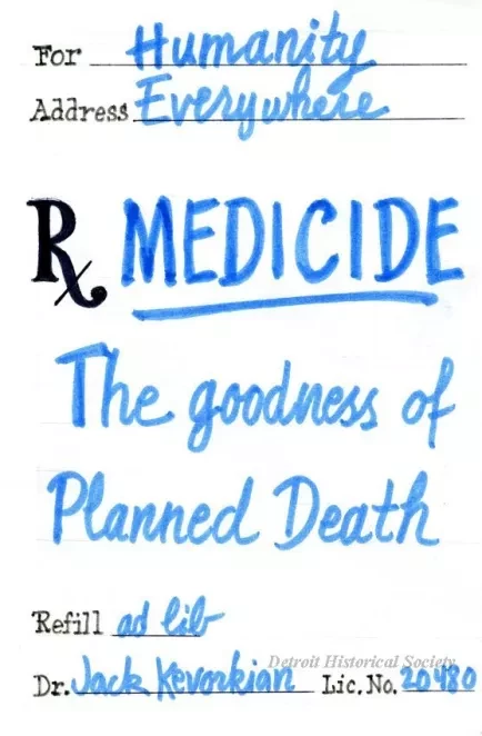 One drawing in black and blue ink entitled "Medicide; The goodness of Planned Death" by Dr. Jack Kevorkian. The drawing may have been considered for use as a possible cover design or advertising art for his book of that title. An accompanying photocopy shows a finished design.