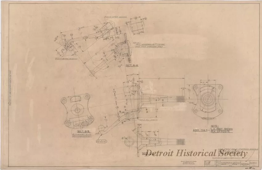 One drawing entitled "Steering Knuckle Assy. [Assembly], R&L [Right & Left]." The drawing consists of black pencil on vellum paper and shows front and section views of the steering knuckle assembly for an automobile. The title block in the lower right corner of the sheet shows the last name of the draftsman, "Rawnsley," and a date of "1-23-29" as well as an approval by "JSB [James Scripps Booth]." The drawing number is shown as "CC2211." Black ink stamps show "Property of James Scripps Booth - Detroit."