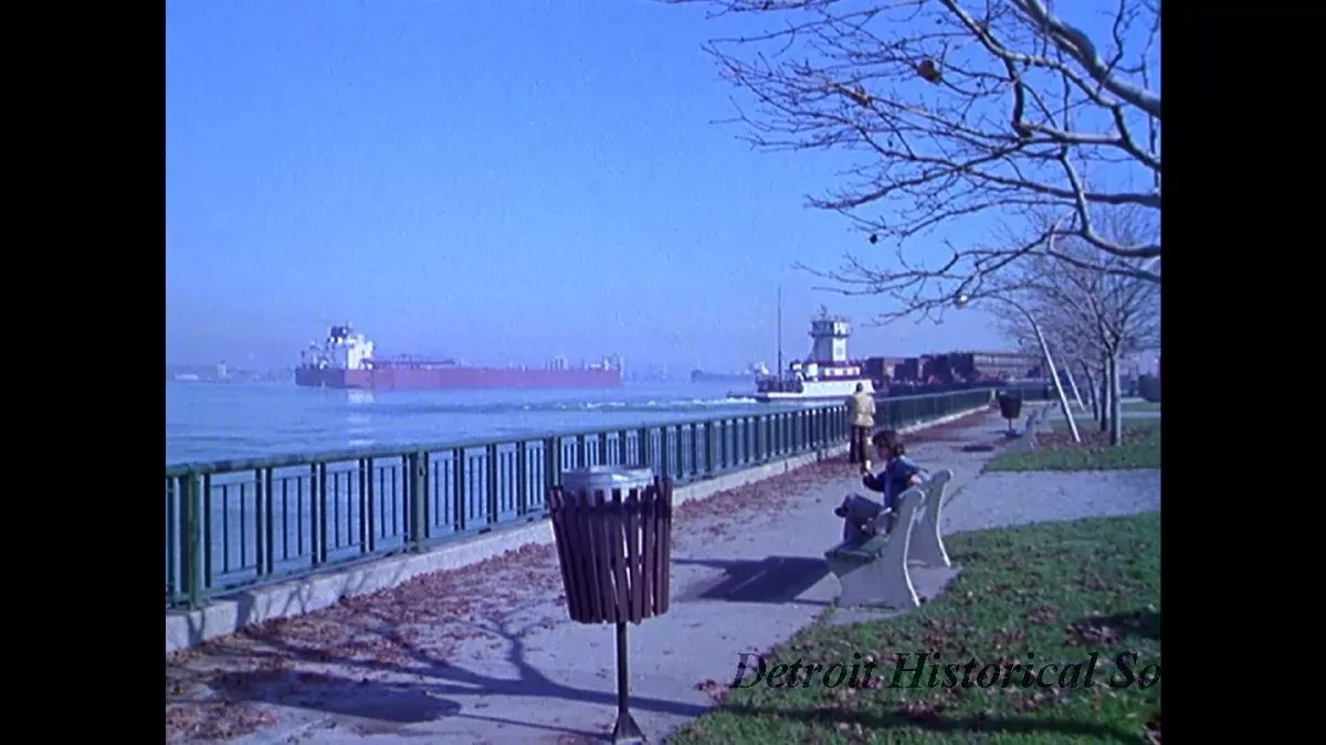 The camera then moves to Dieppe Gardens on Windsor's riverfront of a long series of shots featuring the river, the Detroit skyline, traffic on the river, and activity in Dieppe Gardens. These shots include a tugboat pushing a barge loaded with railroad cars up the Detroit River, pans back and forth across Detroit's riverfront from Joe Louis Arena to the Renaissance Center, another tug pushing another railroad car-laden barge up river, the National Steel Corporation freighter GEORGE A. STINSON, heading up river, the Upper Lakes Shipping Limited freighter CANADIAN TRANSPORT, a person in the park a person feeding seagulls, and the "French Settlement of the South Shore" Ontario Heritage Trust historical marker in the park.