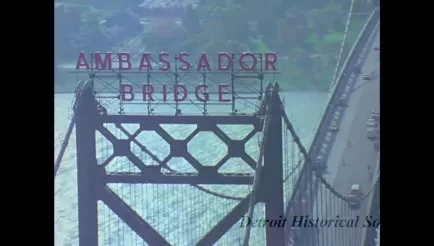 The camera, still in the helicopter, then circles around the Ambassador Bridge for several shots. These takes include a pan across the bridge from the Canadian side, the signs atop the bridge's towers, and a perspective with Detroit's skyline in the background.