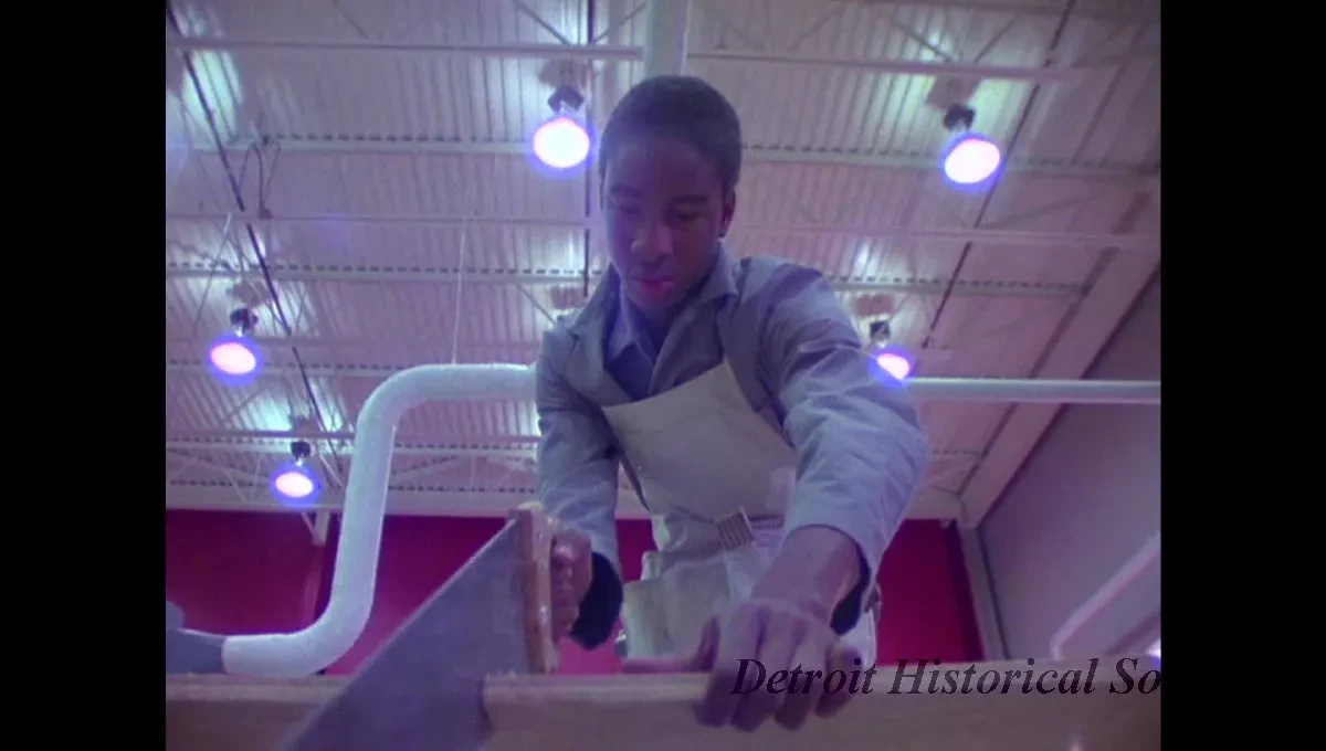 The next segment is shot at the A. Philip Randolph Vocational/Technical Center on the northwest corner of West McNichols Road and Hubbell Avenue. It begins with a shot of the sign on the building's exterior. Then, inside students are filmed in a carpentry class.