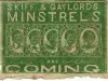Small card-sized handbill advertising Skiff and Gaylord's Minstrels. The recto is printed in green and bears an illustration of five people in blackface, each surrounded by an overlapping oval-shaped frame. "Skiff & Gaylords Minstrels are Coming," is printed above and below. The verso is printed in red, and depicts the shield and eagle from the Great Seal of the United States, surrounded by a ribbon-shaped motif which reads, "The best singers, the best dances, musicals, violinists, operatic, choruses, and the best brass band in the world."