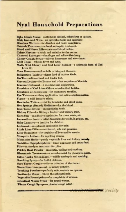 Handbill advertising the Nyal Company's Yellow Pills for torpid liver on the recto and containing a long list of Nyal's other products, and what they can be used to treat on the verso.