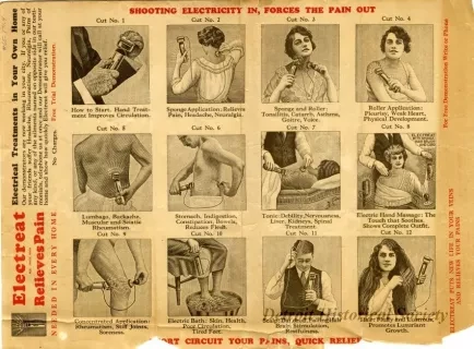 Two sided instruction sheet for the Electreat, an electrical device intended to have beneficial effects on one's health, sold by the Electreat Manufacturing Company of Peoria, Illinois. Twelve diagrams demonstrating different ways the Electreat can be used are on the recto beneath the header, "Shooting Electricity in, Forces the Pain Out." The recto contains many brief testimonials about the Electreat's uses ranging from massage to healing a child who was born paralyzed.