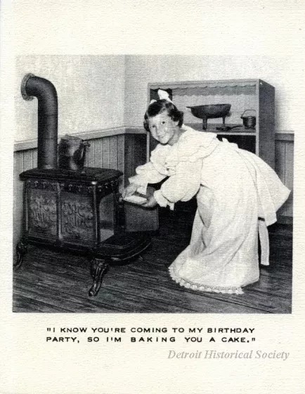 One invitation to a 5th birthday celebration of the Detroit Historical Museum on July 24, 1956. The bi-fold invitation is printed in black text on light tan paper. On the front, it shows a black and white photographic image of a young girl who is baking a cake. Celebration details are shown on the inside pages.