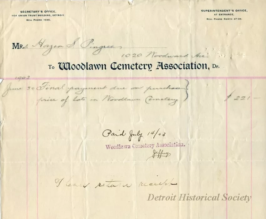 Invoice for Frances A. Pingree's final payment of $221 to Woodlawn Cemetery Association for the purchase of lots 151, 152, 163, and 164 in Section 14 of the cemetery on June 30, 1903. The invoice is marked, "paid July 14/03," and is signed "Jeffery."