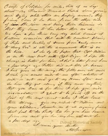 Letter reads, "My Dear Sister, I have only one excuse for not writing to you before that in my time is all taken up with Camp duties, and drilling and moving so much that we have noting settled. We are now about one mile from Sharp burgh on the Potomac near the Battle field of Antietam in Gibbon's Brigade, 1st Army Corps. Several of the Michigan regiments are close by us although not in our Brigade. Our living consists of hard biscuits, fat pork, and coffee. Breakfast, Dinner and Supper all alike. Bed one blanket on the ground and over coat over us, we have shelter tents which we have to get down on our knees and crawl into them. You may think strange we do not have more blankets with us. The only reason is the Government would not carry them. I had to leave my trunk in Washington and take nothing but what I could carry on by back. We do not expect to stay here long. All are very anxious to leave this camp as soon as possible. We cannot buy anything here. The stores in town are all shut up, the citizens most all left. Every house shows the effect of shot and shell. The fields are all cleaned of fences, nothing to be seen, but camps of soldiers for miles. Sight of us lays about - One house and wounded Rebels, some groaning and dying, while others are limping around. Their friends come to see them from the other side of the river and bring them luxuries, so that they seem to live better than we do. We have a fire show every day which consists of Balloon ascension that with the constant blowing of Fifes and beating of drums from, 'early morn to dewy eve' in all the amusements that is on the fields. I see by the paper that Capt. William is on the new boat with Capt. Vigen, I hope the change is better for him. I red a letter from home a days ago, Father did not like it because I had gone in the army. The folks were all well I wish you would write to me often whether I write or not and go to my house often and see and see how they get along if they need anything that you can do for them I hope you will accommodate. I expect to be paid off on the first of the next month when I shall send them money. Give my respects to William and your children. Remember to me all enquiring friends. Don't fail to see Betty, tell her you have heard from me and give her my love, I wrote her a few days ago. I remain your brother, A. W. Sprague."