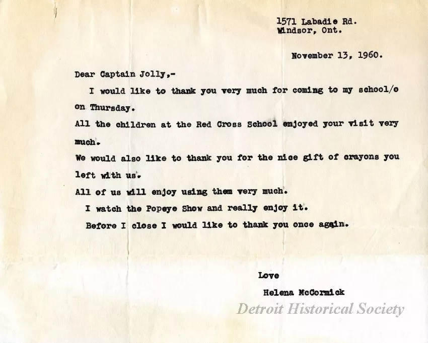 One typewritten letter, dated November 13, 1960, from Helena McCormick to Captain Jolly (Toby David) to thank him for visiting the Red Cross School in Windsor, Ontario. McCormick thanks Captain Jolly for visiting, and for gifting her class crayons. She also notes that all of the students enjoyed his visit and she watches Popeye and enjoys it.