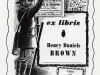 Book plate bearing a lithograph by William Biddleman made as a Christmas present for Henry D. Brown. In the image, a man on a ladder pastes a theater poster to a wall above a large sign which reads, "ex libris, Henry Daniels Brown." A small sign below reads, "Visit the Detroit Historical Museum."