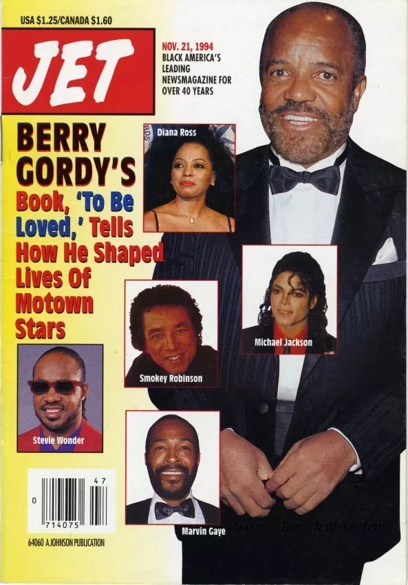 November 21, 1994 issue of Jet magazine, featuring a cover story on Berry Gordy, Jr. entitled, "Berry Gordy's Book, 'To Be Loved,' Tells How He Shaped Lives of Motown Stars," written by Robert E. Johnson. The article, retracing the stories in Gordy''s autobiography, tells of his beginnings in boxing, the founding of Motown, his relationship with Diana Ross, his work with Stevie Wonder and Michael Jackson. The article is accompanied by several black and white photos of Gordy and Motown artists. Gordy is pictured on the cover surrounded by inserts of photos of Diana Ross, Smokey Robinson, Stevie Wonder, Marvin Gaye, and Michael Jackson.
