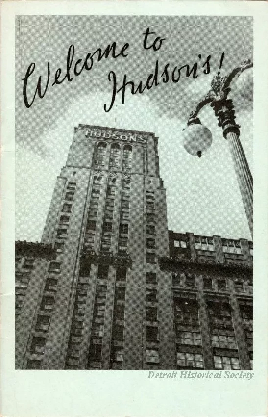 Hudson's employee manual containing the store's history, employee regulations, and a list of customer services. The booklet is staple-bound in a green cover printed with a half-tone image of the store's tower as viewed from below at street level.