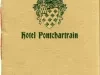 Small club breakfast menu booklet from the Hotel Pontchartrain containing twenty-five different breakfast meals of ascending price ranging from fifty cents to one dollar. The cover is brown with the coat of arms of Louis Phélypeaux, comte de Pontchartrain embossed in green.
