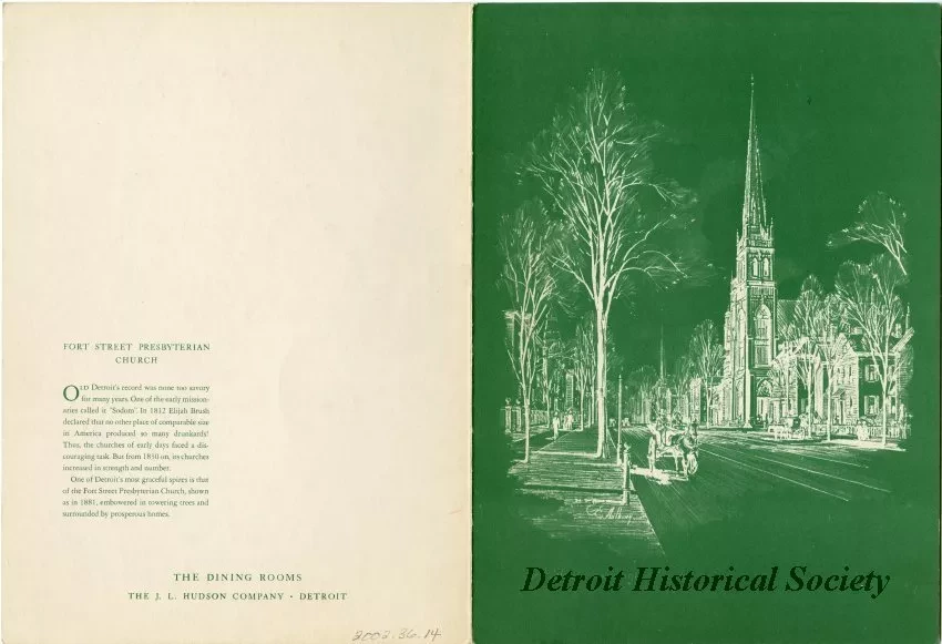 Half-folded J.L. Hudson Company Dining Rooms menu, dated February 21, 1950, bearing an illustration by E.E. Anthony of Fort Street Presbyterian Church as viewed from the west on the north side of Fort Street in 1881, in white on green on the cover. A brief passage contrasting the early reputation of Detroiters as drunkards expressed by Elijah Brush, with the growth of its churches, is on the back cover. Within the menu is divided into the sections "Soups and Appetizers," "Shopper's Luncheon One Dollar," "Sandwiches," "Desserts," "Fruits," "Hudson Made Ice Cream and Sundaes," and "Beverages." A note along the bottom of the menu's interior informs, "Detroit's Police Department asks everyone's help in its traffic safety program, "Watch Out For Kids."