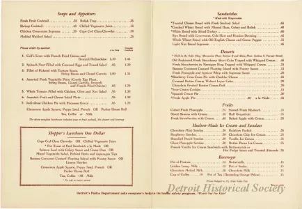 Half-folded J.L. Hudson Company Dining Rooms menu, dated May 19, 1950, bearing an illustration by E.E. Anthony of the Federal Building and Post Office on Fort Street in white on red on the cover. A brief passage about early post offices in Detroit is on the back cover. Within the menu is divided into the sections "Soups and Appetizers," "Shopper's Luncheon One Dollar," "Sandwiches," "Desserts," "Fruits," "Hudson Made Ice Cream and Sundaes," and "Beverages." A note along the bottom of the menu's interior informs, "Detroit's Police Department asks everyone's help in its traffic safety program, "Watch Out For Kids."