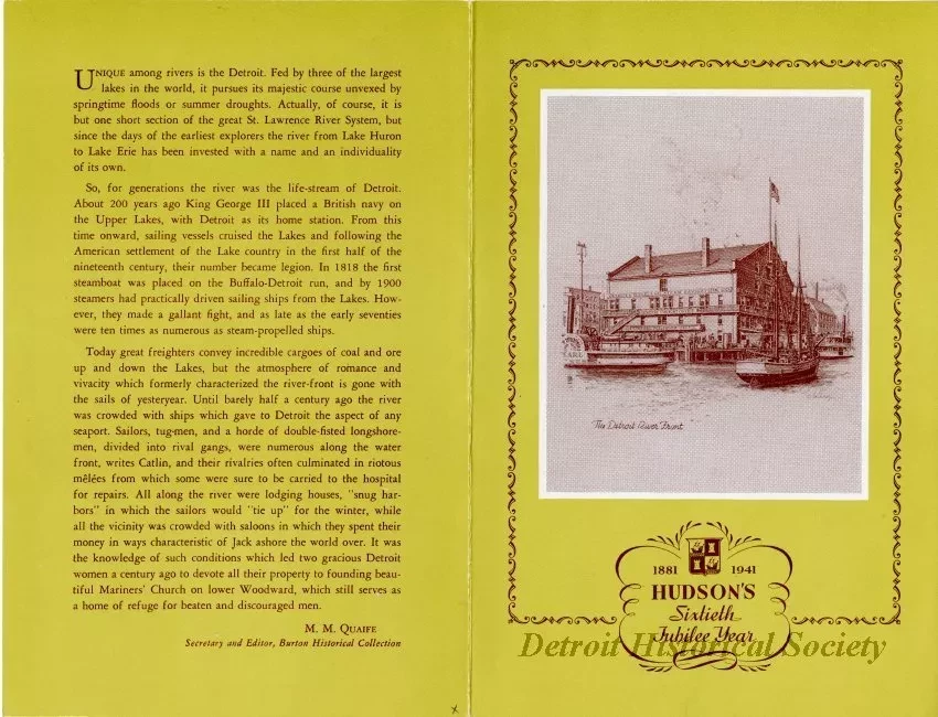 Hudson's Sixtieth Jubilee Year menu, dated October 3, 1941, bearing an illustration by E.E. Anthony of the Detroit and Cleveland Steam Navigation Company building on the riverfront, c. 1881 surrounded by a chartreuse border. The excursion steamer PEARL is docked on the left side of the image. A sailboat is in the foreground on the left. Dock workers are depicted moving crates and barrels beside the D&C building. A passage about the river and riverfront written by Milo Milton Quaife of the Burton Historical Collection is on the back cover. Within the menu is divided into the sections "Shopper's Fifty Cent Luncheon," "The Forty Cent Luncheon," "Soups," "Plate Luncheons," "Salads," "Vegetables and Potatoes," "Waffles with Coffee, Tea, or Milk," "Sandwiches," "Desserts," "Fruits," "Ice Cream and Sundaes," and "Sodas and Beverages."