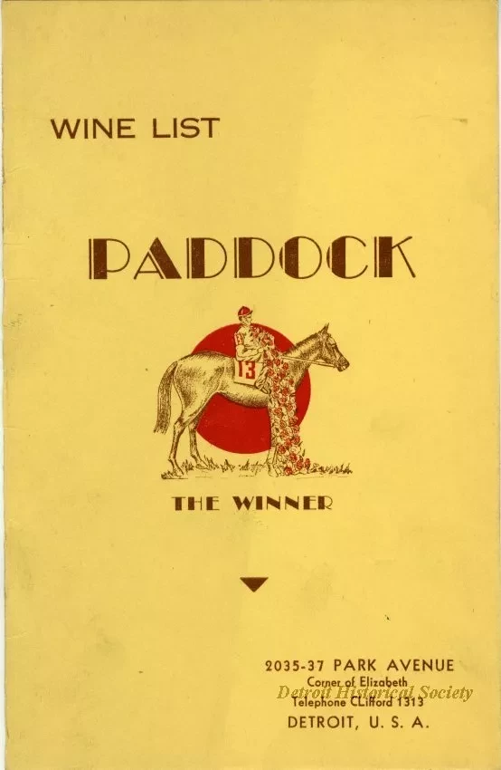 Wine list booklet from Paddock at 2035-37 Park Avenue. The cover is yellow cardstock with an illustration of a derby horse and jockey, bearing the number 13, and draped with flowers. "The Winner," is printed below. The menu lists cocktails, egg nogs, flips, punches, Scotch, Irish drinks, brandys, long drinks, bottles beers and ales, rickeys, sours, mineral and sparkling water, cordials, still wines, French wines, and champagnes.