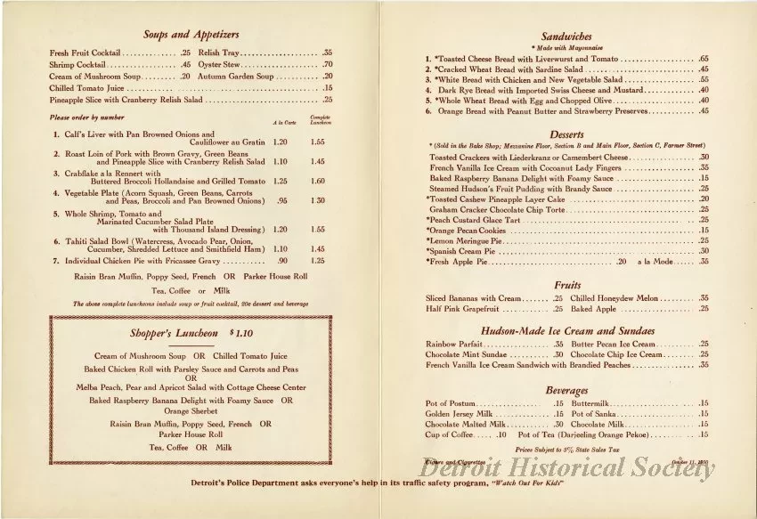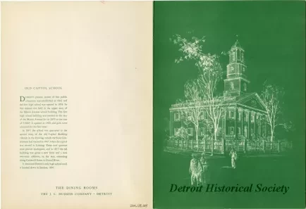 Half-folded J.L. Hudson Company Dining Rooms menu, dated October 11, 1950, bearing an illustration by E.E. Anthony of Capitol Union School in white on green on the front cover. A brief passage about the school and early education in Detroit is on the back cover. Within the menu is divided into the sections "Soups and Appetizers," "Shopper's Luncheon," "Sandwiches," "Desserts," "Fruits," "Hudson-Made Ice Cream and Sundaes," and "Beverages." A note along the bottom of the menu's interior informs, "Detroit's Police Department asks everyone's help in its traffic safety program, "Watch Out For Kids."