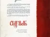 Half-folded menu from Cliff Bell's at 2030 Park Avenue. The cover is printed with a painting of a bell against a red background. Inside the menu is divided into the sections, "To Begin With," "Soups," "Neptune's Domain," "Somethin' Special," "Dessert Isle," "Potatoes and Vegetables," "Beverages," "The Broiler Room," "Salad Bowl," and "Roast Prime Rib of Beef," as well as a removable "Entrees" card. A brief passage about the history of the restaurant is printed on the back of the menu.