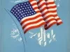 Half-folded Christmas dinner menu from the Whittier, dated Monday, December 25, 1944. An illustration of the American flag flying with a white and blue three-quarters overhead view of a city, a barn and farm house, a church, and a factory in the background are on the cover. Passages about the holiday, an illustration of a woman making plum pudding, and the dinner menu, priced at $2.50 a person are printed within.