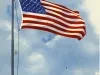 Half-folded Stouffer's dinner menu dated July 5, 1965. A color image of the American flag, flying against a cloudy sky is printed on the cover, along with a stanza from The Star-Spangled Banner. A "Liberty Bell Dinner" consisting of fried chicken, and a series of Independence Day Dinners are listed within, along with other dinner plates, grilled items and desserts. The Pledge of Allegiance is printed on the back cover.