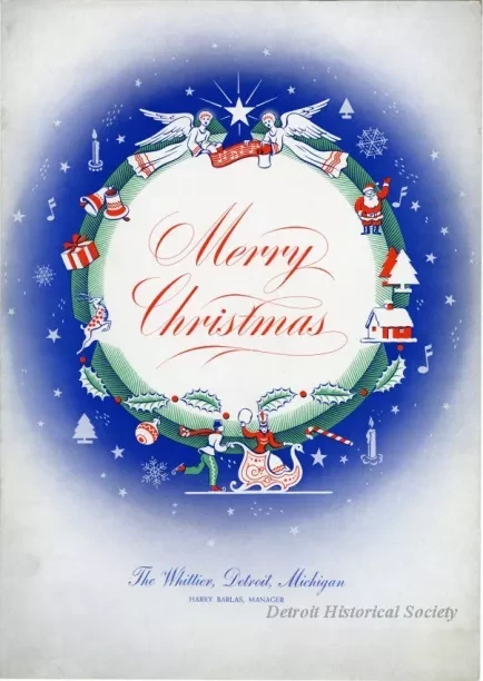 Half-folded Christmas dinner menu from the Whittier, dated Thursday, December 25, 1947. The menu is printed on glossy paper with the words "Merry Christmas" surrounded by a stylized illustration of a wreath dotted with ornaments, bells, Santa Claus, and other Christmas imagery. In addition to the menu, priced at the flat rate of $2.75 per person, the menu also contains an illustration of a woman making plum pudding, along with two passages about the dessert. Harry Banks is listed as the manager.
