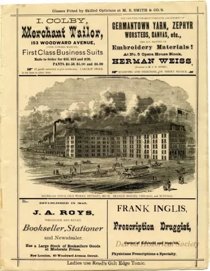Sheet music advertisement "Musical Gem" No. 4, published by A Nims, Sept. 1879, featuring "Le Mardi Gras Quadrille" by Camille Schubert. Advertisers include Detroit area opticians, jewelers, prescription druggists, brewers, tailors, and stores. The booklet is stamped on the front and back covers with "Michigan Stove Co., Detroit, Mich." and the recto of page 3 features an illustration of Michigan Stove Co.'s Works by the Bureau of Illustration in Buffalo, N.Y.