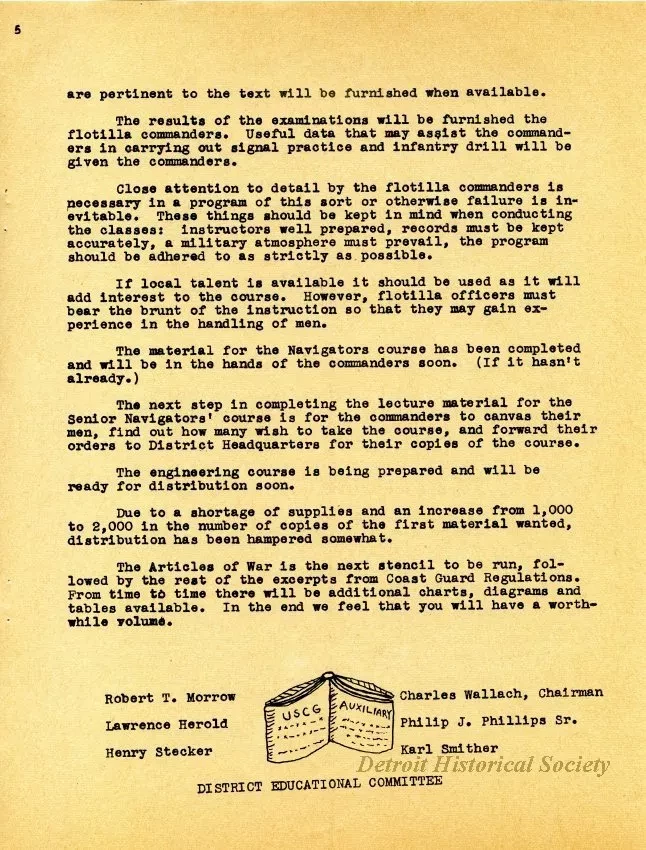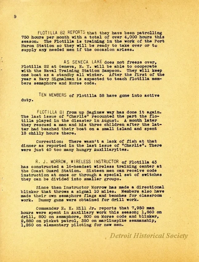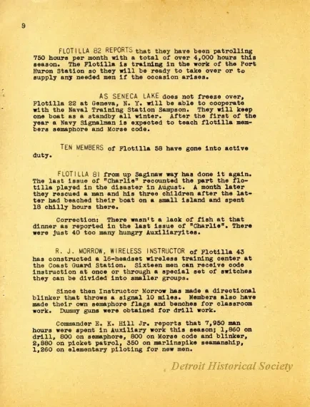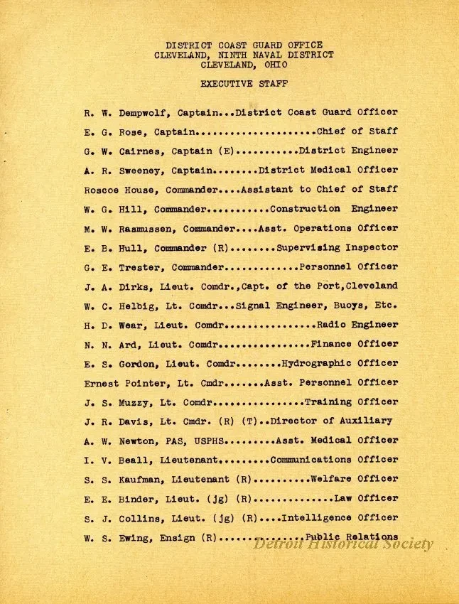 One copy of the newsletter, "Charlie Noble," which was published by the U.S. Coast Guard Auxiliary, Cleveland District, and was dated January, 1943. The 12-page booklet-style newsletter was printed in black text on white paper. It listed the names of executive staff of the USCG Ninth Naval District, Cleveland, and included a message from the Commander as well as short articles about people, education programs, and recent events in the district. Several black and white photographic images were shown with the articles. The front cover features an image of the Coast Guard Reserve vessel, CGR173, "Alburys".