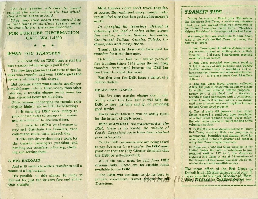 Trifold pamphlet-format newsletter published by the Department of Street Railways for March of 1958, explaining their new policy ending free transfers. The newsletter also includes information on events--and the bus routes to reach them--including a screening of the German film "The Montebank Krull" at the Detroit Art Institute, the Moran house display in the "Cadillac's Village" exhibit at the Detroit Historical Museum, the Belle Isle Aquarium and Conservatory, travel films at library branches, performances by the Wayne State University Symphony Orchestra and Wayne Theatre, and Red Wings games. A passage about recent efforts by the American Red Cross is also contained within.