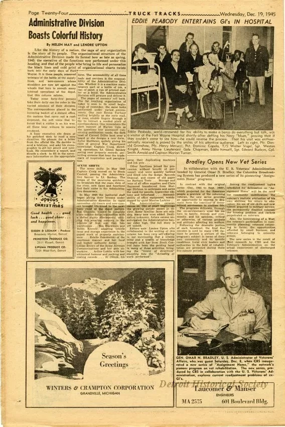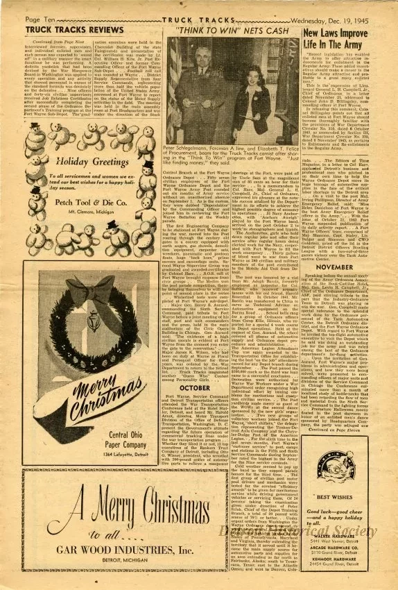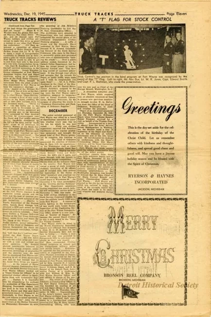 One copy of the newspaper, "Truck Tracks," Vol. V, No. 2, dated Wednesday, December 19, 1945. The newspaper subtitles show "Published in the Interest of the Military and Civilian Personnel of Fort Wayne, Detroit 32, Michigan" and "The World's Fastest Moving Parts Depot." The 32-page newspaper includes articles about ongoing work in the fort, history of the fort, personnel, Christmas greetings, and advertisements. Black and white photos are also shown throughout the publication. The front-page headline reads "Wayne Hallowed Ground in History of Nation" introducing a long history of the fort including WWII developments. There is a front page "Letter of Appreciation" from the commanding officer Col. John Billingsley, Jr., announcing the end of the publication as then organized. This is a retrospective edition that includes a detailed month-by-month discussion of all important activities at the fort during the war years. It also includes a "then-and-now" photo spread. Some of the people who are pictured include: Col. John D. Billingsley, Jr., Col. Ray M. Hare, Peter Schlegelmann, Col. Harry Adamson, Col. Alexander G. Stone, Eddie Peabody, and Harry Davis.