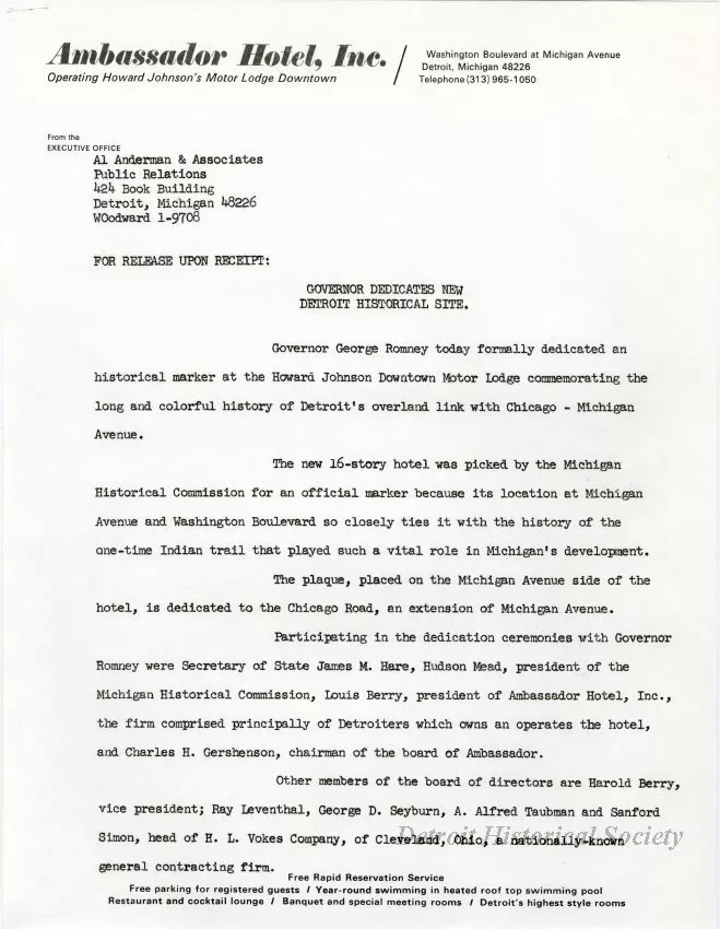 White pocket-folder containing information about the new Howard Johnson's Downtown Motor Lodge. Includes a welcome letter from the Board of Directors of Ambassador Hotel, Inc. and a press release titled, "Governor Dedicates New Detroit Historical Site".