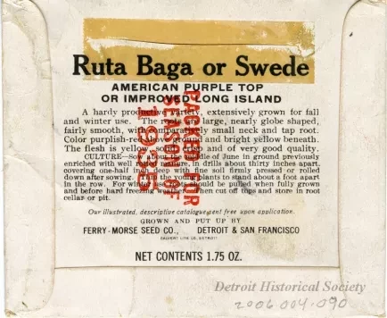 Empty packet of Ferry-Morse Seed Company American Purple Top Rutabaga seeds, priced at $0.20. A color illustration of a rutabaga by the Calvert Lithograph Company is on the recto. A description, instructions, and a stamp which reads, "Packed for season of 1935," are on the verso.