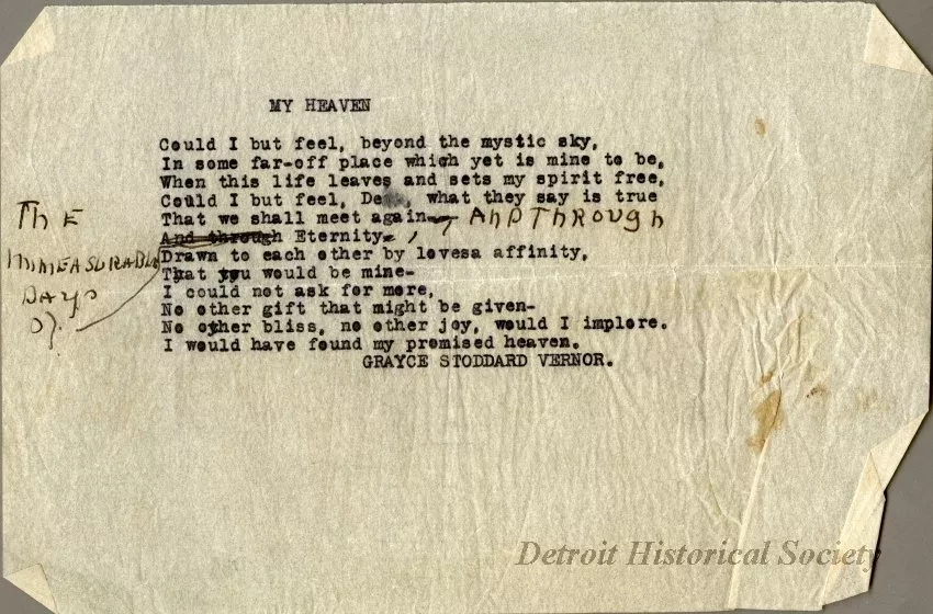 Poem by Grayce Stoddard Vernor, typed on vellum paper with handwritten alterations.