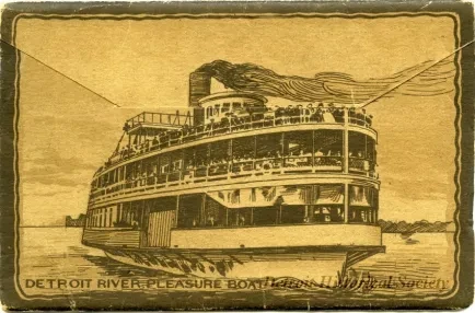 Black and white souvenir folder with the Detroit Post Office on the postage side, and Detroit River Pleasure Boat on the fold side.