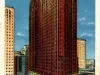 One postcard of the Union Guardian Building. The postcard has a color drawing that shows an elevated view of the building and its decorative architecture. Blue printed text on the verso reads "This building located on Griswold, Detroit's Wall Street, is 30 stories tall and is in the bizarre Mayan architecture. Its towers are flooded at night with many colored lights."