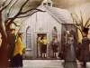Color postcard depicting a diorama of people standing outside of a board-and-batten church during winter.