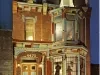 Color photographic postcard a night-time view of the repurposed three-story Second Empire house at 4470 Second Avenue. Mannequins wearing dresses are displayed in the first floor window for a clothing store within.