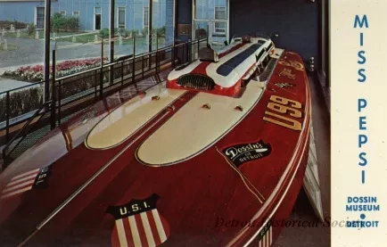 Color postcard featuring a photograph of the hydroplane Miss Pepsi on display in the Dossin Great Lakes Museum, made by Hiawatha Card of Detroit and printed by Dexter Press, Inc. in West Nyack, New York. Text on the back of the postcard reads as follows: