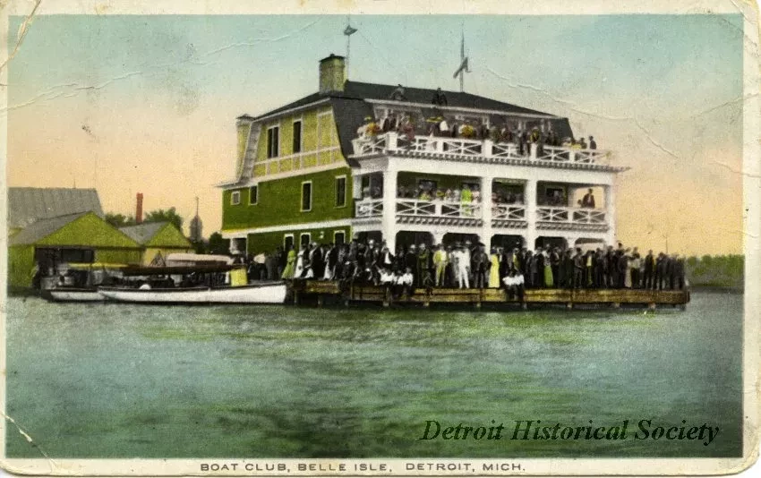Color postcard depicting the Detroit Boat Club, with the Detroit River in the foreground. Many people crowd the balconies and dock.