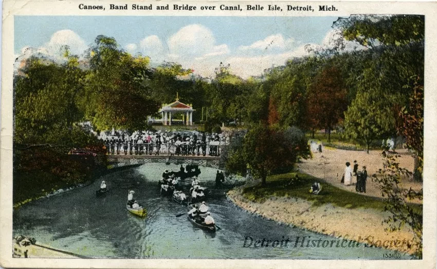 Printed on verso: Canoes, Band Stand and Bridge over Canal, Belle Isle. Canoeing is the leading sport at Belle Isle, Detroit's largest playground. Its 702 acres are threaded by many miles of canals and lakes, affording an ideal spot in which the light little craft cruise about by thousands. Band concerts are given at the city's expense during the summer afternoons and evenings and on such occasions the canoeists are present in great numbers.