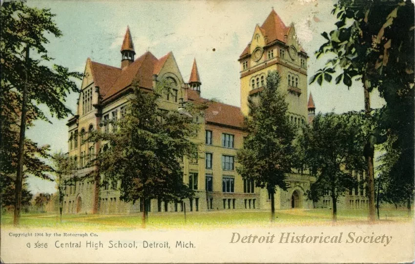 Color postcard depicting Central High School from the corner of W Hancock Street and Cass Avenue.