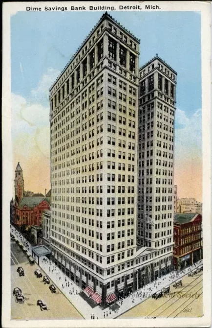 Printed on verso: The Dime Bank Building is 23 stories high and is the best elevation from which to view the city and its surroundings. On a clear day from here can be seen Canada, Lake St. Clair, Belle Isle and beautiful Detroit, for a distance of five miles. It contains 1000 offices.