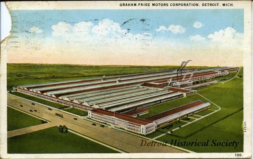 Color postcard depicting an aerial view of the Graham-Paige Motors Corporation with W Warren Avenue in the foreground. Printed on verso: "Graham-Paige Motors Corporation. Main plant located at West Warren Avenue and Detroit Terminal Railroad. One of the most modern automobile plants in the Detroit area. Main plant has 721,430 square feet of manufacturing space. Company also has large body plant in Wayne, Michigan, a Detroit suburban town.". Handwritten note on verso.