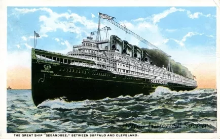 One postcard of the passenger steamship, SS SEEANDBEE, of the C&B Line (Cleveland & Buffalo Transit Company). A color drawing shows a port side bow view of the sidewheel steamship which is underway in fair weather on Lake Erie. Many passengers are standing along the ship decks. Small black printed text along the lower left edge reads "The Great Ship "Seeandbee," Between Buffalo and Cleveland." Small printed text on the verso reads "The largest and most costly passenger steamer on inland waters of the world. Actual dimensions - Length 500 ft; Breadth 98 feet 6 inches. 510 staterooms and parlors accommodating 1500 passengers." Additional printed text reads "Published by Braun Post Card Co., Cleveland, Ohio," and Made in U.S.A."