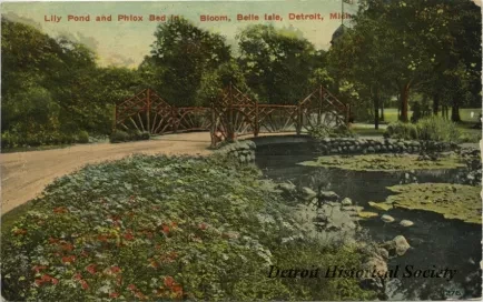 Printed on verso: Lily Pond and Phlox Bed in Bloom, Belle Isle. Belle Isle is in the Detroit River, between Detroit and Windsor, Canada. The Island contains 702 acres and is entirely covered with one of the most beautiful parks in the United States, having some 21 miles of Macadam Roads; a magnificent Casino; Pavilions; Boat Houses; Aquarium; Horticultural Hall and Zoological Gardens. The Island was purchased by Detroit in 1879 and has since then expended $1,600,000 in beautifying it.