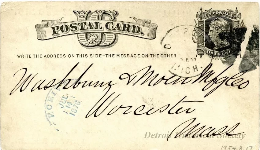 Postcard from Snow's Iron Works of Detroit, Michigan, to Washburn & Moen Manufacturing Company of Worcester, Massachusetts, requesting a quote on galvanized wire, dated July 12, 1876. The postcard has black printed text on white paper with a message that has been handwritten in black ink.
