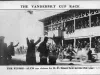 Black and white postcard depicting the finish line at The Vanderbilt Cup Race on Hempstead Plains, Long Island, New York. A blurred car and a grandstand filled with spectators are in view.
